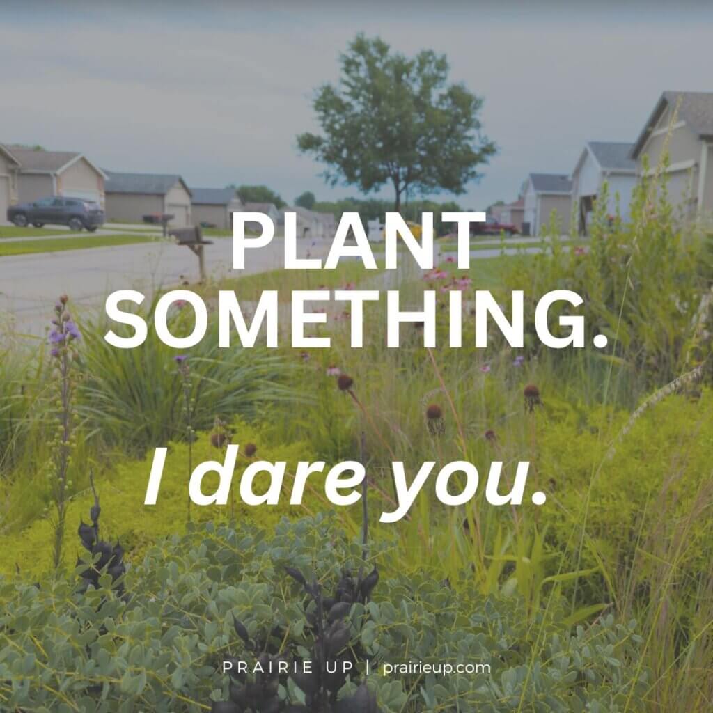 Front yard meadow bed full of diverse native plant flowers and grasses in the foreground, contrasting with the background of suburban monoculture lawns and hard concrete surfaces like streets, sidewalks, and driveways. We can do better for the health and resilience in the places we call home.